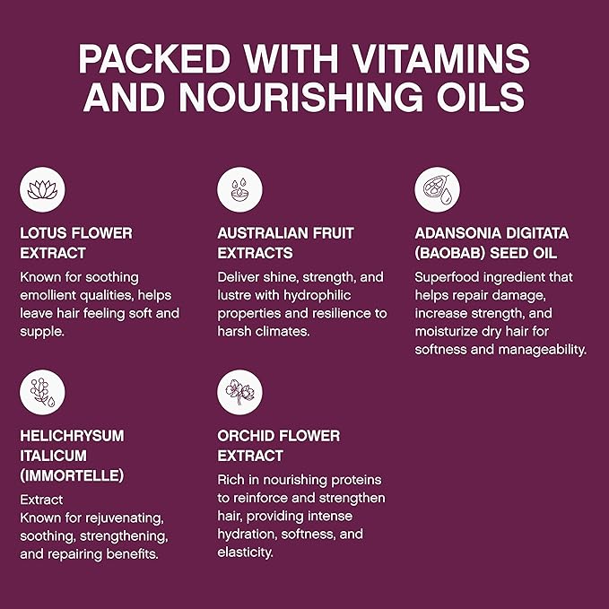 - Hair Hydration Ingredients: Formulated with Amino Acids, Baobab Seed Oil, and Lotus Flower Extract, this hair treatment strengthens, softens, and restores ageing hair