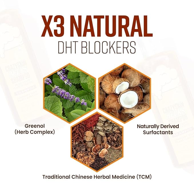 - 🍺 NATURAL DHT BLOCKERS : Led by Beer Yeast, this shampoo has patent natural ingredients that promotes new hair growth and prevents further hair loss ; Traditional Orient Herbal Medicine, Greenol(Herb Complex -Lavender/Bergamot/Freesia/Peppermint/Chamomile/Rosemary), Natual derived surfactants work best in hard water environments.