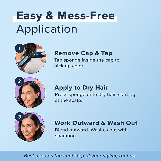 - No Mess - Flawless Coverage: Skip the product fall-out. Our advanced root coverup formula is contained in the cap and adheres to your sponge for no-mess application. Simply remove the cap and gently tap the sponge inside to transfer color to applicator. Apply to desired area on dry hair, starting at the scalp and working outwards. The ultimate hair root touch up powder for full-bodied, knock-out look.