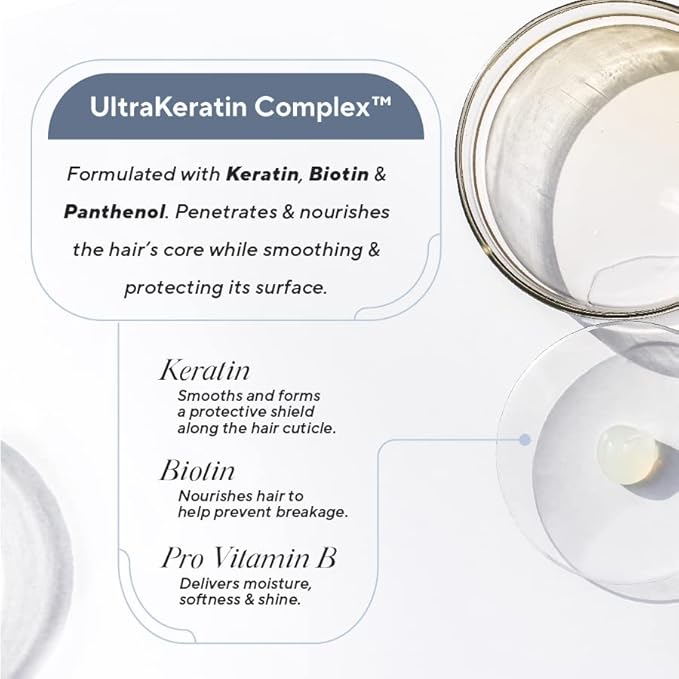 - RESTORES STRENGTH & PREVENTS DAMAGE: Restore and strengthen weak and damaged hair. UltraKeratin Complex penetrates & nourishes hair while smoothing & protecting its surface, repairing your hair from the inside out. Formulated with Keratin, Biotin, & Panthenol.
