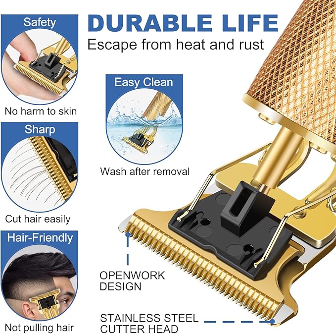 - 【T-Style Zero-Gap Cutter Head】Adorned with a precision-crafted T-shaped stainless steel cutter head, 4cm wide, this clipper seamlessly blends artistry with function. Its razor-sharp blades glide through hair effortlessly, ensuring a smooth cut without any skin irritation. A protective cover shields the cutter head from wear, allowing for hassle-free cleaning under running water.
