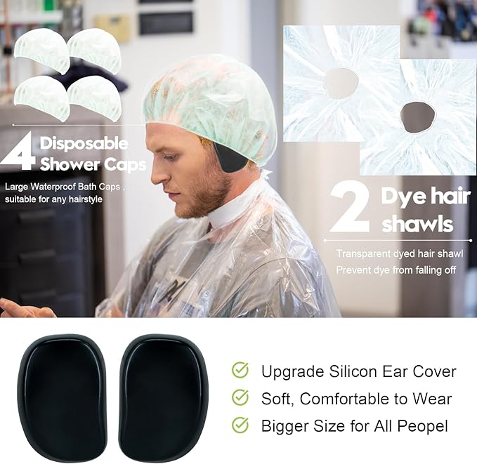 - Professional Hair Dye Kit: Come with 1 bowl; 2 hair dye brush; 1 hair dye comb; 1 agitator; 1 storage bag; 2 disposable shawl; 4 hair clips; 1 pair of earmuffs; 1 pair of gloves; 4 disposable bath cap. Perfect for home or salon use