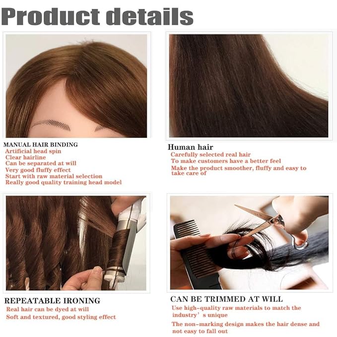 - đăMaterialăMannequin head with 100% high quality real hair. All of the hair has been washed and disinfected. Length of hair: 18 Inch; Color: Brown.