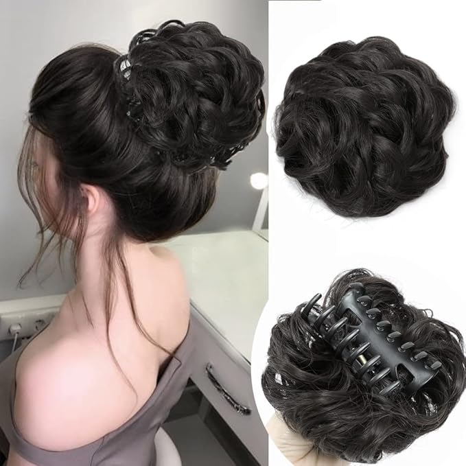 Women's Black Synthetic Wavy Curly Bun Clip-in Claw Hairpieces, 10-Inch