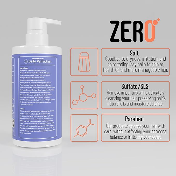- Salt-Free, Sulfate-Free, Paraben-Free: Daily Perfection's formula is free from sulfates, parabens, and the harsh effects of salt. Our products offer a gentle cleanse that preserves your hair's natural oils.