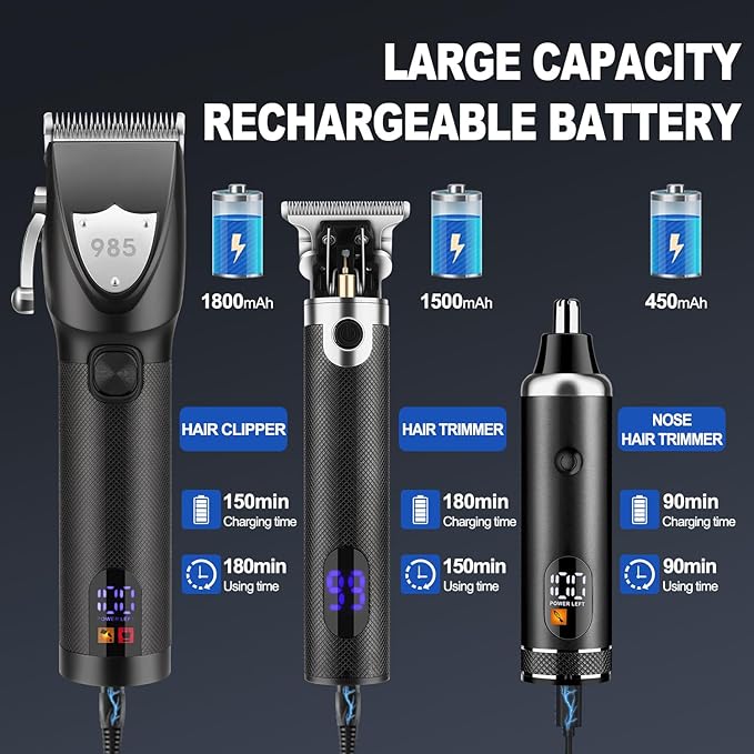 - Long Battery Life &Digital Display:The clippers set is built in rechargeable premium and safer batteries, which can offer up to 180 minutes of running time with charging 2.5 hours for the hair clipper , offer up to 150 minutes of running time with charging 3 hours for the hair trimmer,offer up to 90 minutes of running time with charging 1.5 hour for the nose trimmer .The LCD Display can clearly show you the remaining charge, battery status and remind you to drip blade oil in time.