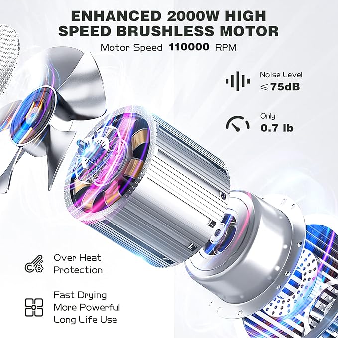 - 【2000W Powerful High-speed Motor, Super-fast Drying】 slopehill professional hair dryer features an airflow of 26 m/s and a speed of 110,000 RPM, suitable for salon and home. Compact and stylish brushless hair dryers is more suitable for women