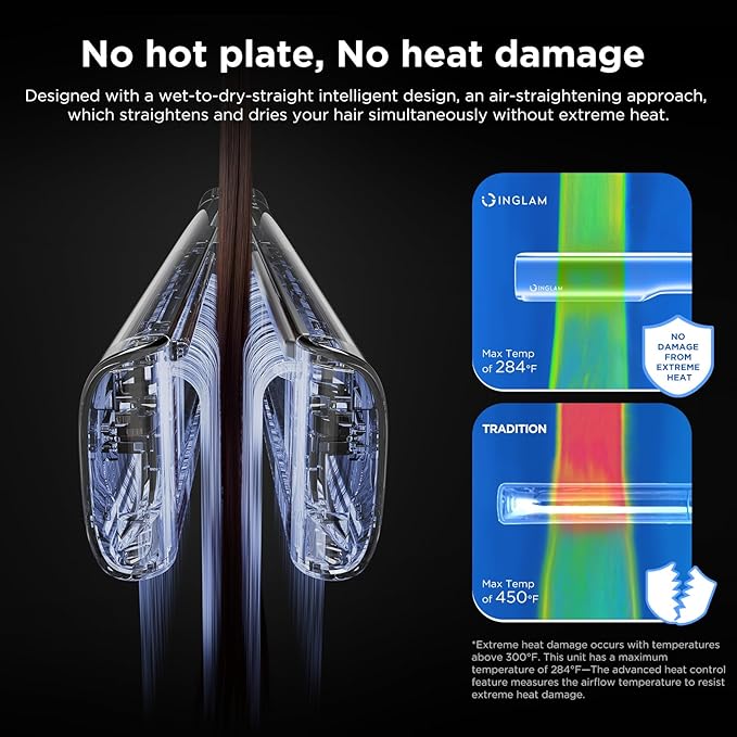 - No Hot Plate, No Heat Damage - Designed with a wet-to-dry-straight intelligent design, the hair dryer straightener uses precise heated directional airflow to straighten and align your tresses efficiently and effortlessly. The entire process does not require extreme heat which helps maintain your hair's strength and reduce breakage, ensuring retain natural moisture from root to tip.