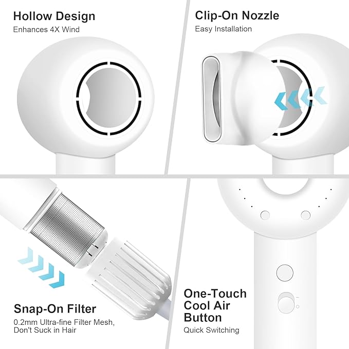 - Ultra-Fast Drying & Precision Airflow—Equipped with a 160,000 RPM brushless motor, this high-speed hair dryer delivers wind speeds up to 22m/s, which are 5 to 6 times faster than conventional hair dryers. Its innovative hollow design enhances airflow compression, allowing for rapid and even drying without overheating or harming your hair. It dries hair in just 2~5 minutes, significantly reducing drying time and protecting against heat damage.