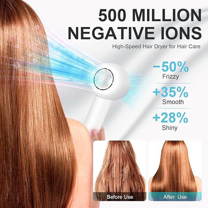 - Anti-Frizz Negative Ion Technology—Featuring advanced negative ion technology, our hairdryer emits up to 500 million high-concentration negative ions. This technology locks in hair moisture, neutralizes static, and reduces frizz, leaving your hair smooth, manageable, and lustrously glossy, offering a salon-quality experience and maintaining your hair's health, shine, and volume.