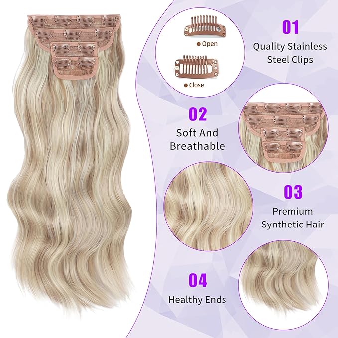 Vigorous Clip in Hair Extensions 20Inch Ash Blonde Mixed Bleach Blonde Hair Extensions Clip Ins 4Pcs Long Wavy Soft Synthetic Hairpieces for Women