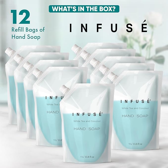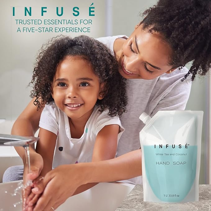 - HOTEL-QUALITY, LUXURIOUS AMENITIES: Enhance your guest experience with the Infuse White Tea and Coconut in a convenient 1-Liter Refill Bag, designed to refill wall-mounted and stand-alone dispensers. Enriched with white tea, coconut, organic aloe, and olive oil, this gentle, daily-use formula suits sensitive skin and hair. Ideal for hotels, vacation rentals, guest bathrooms, and homes, these premium amenities add sophistication and functionality to any hospitality space.