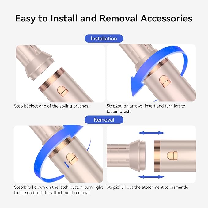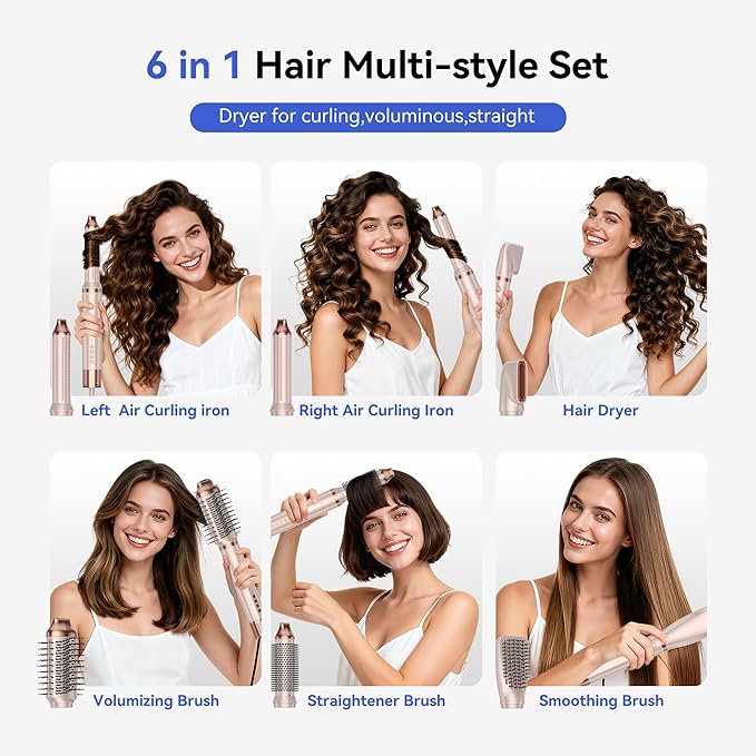 - [Auto Left/Right Air Curler]The hair brush blow dryer set includes two independent 1.25-inch curling barrels (one for each direction) for symmetrical curls on both sides. Utilizing innovative Coanda effect technology, the air curler automatically forms curls with powerful airflow—no twisting or clamping required—delivering salon-quality results effortlessly and efficiently