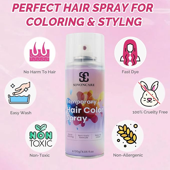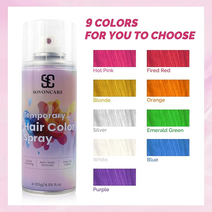 - Temporary Hair Color Spray:Transform your look in seconds with our temporary hair color spray.Cover gray hair, highlight, go bold with bright color, or even try an ombre hair color. Perfect for kids and adults who love to switch up their style!