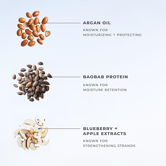 - Nourishes and Strengthens – Infused with baobab protein and argan oil to reinforce weak strands, improve softness, and reduce the appearance of split ends.