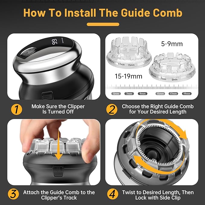 - This hair cutters for men comes with 2 guide combs offering 6 cutting lengths (5/7/9/15/17/19 mm). The guide comb adjusts to your desired length by rotating on the clipper.Whether you're going for a clean Buzz Cut, a stylish Tapered Cut, or a classic Caesar Cut, this self haircut kit gives you the control and precision to maintain your look at home with ease