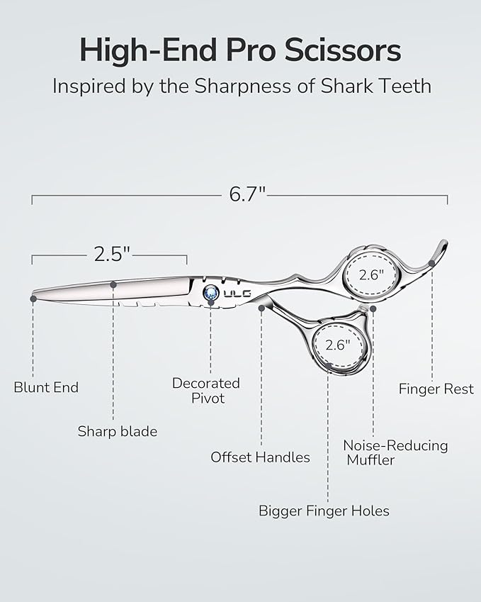 ULG Hair Cutting Scissors 6.7” Shark Series, 100% Japanese Stainless Steel Ultra Sharp, Concave Blade Barber Shears, Ergonomic Offset Handle, Professional Salon Haircut Scissors for Home & Salon Use