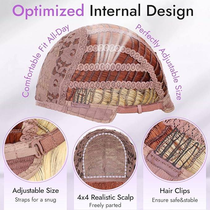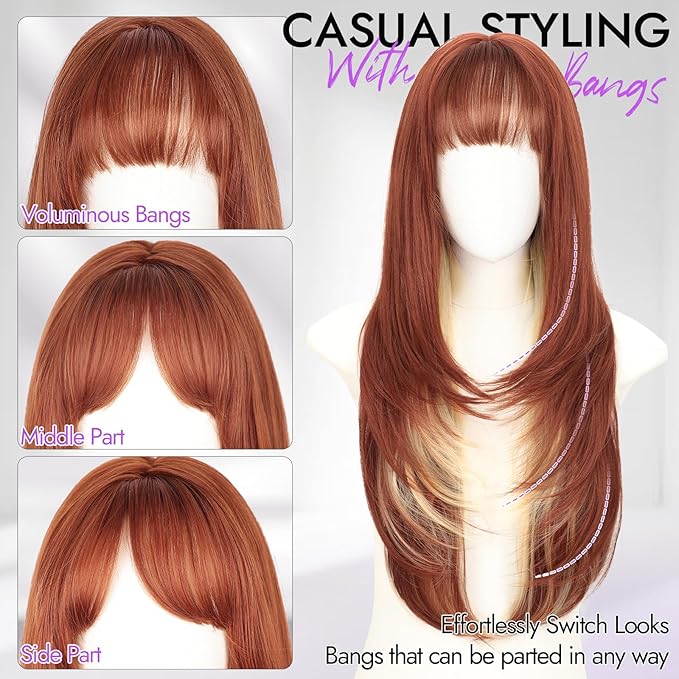 Long Reddish Brown mix Blonde Wig with Bangs for Women,Layered Hairstyle Synthetic Heat Resistant for Daily Party Use 26 inch