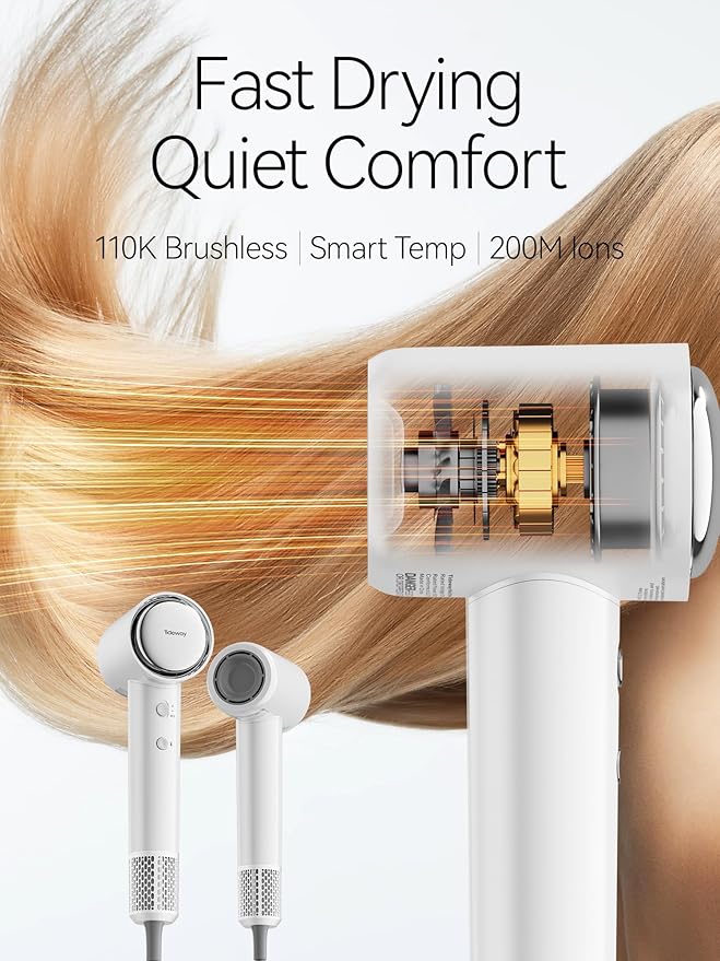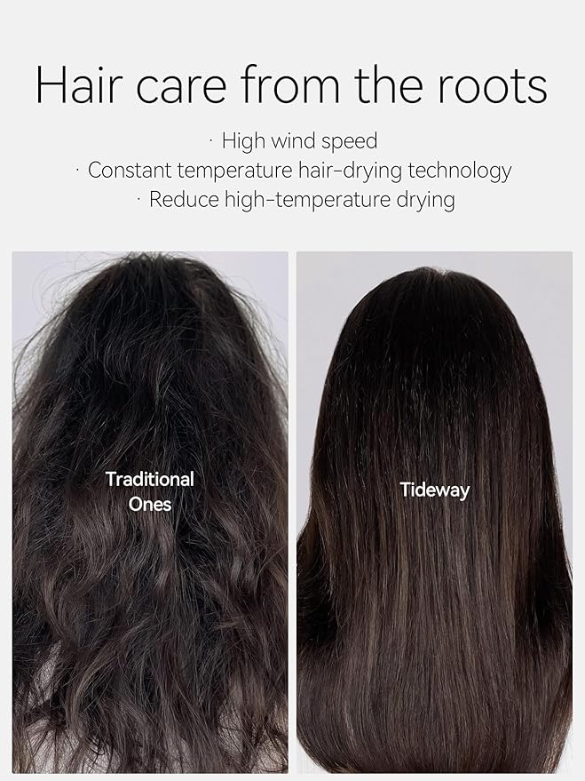 - 110,000 RPM High-Speed Brushless Motor for Fast Drying: Equipped with a powerful 110,000 RPM brushless motor, the Tideway High-Speed Hair Dryer delivers salon-grade airflow for ultra-fast drying. Engineered for all hair types—especially thick, long, or curly hair—it reduces heat damage while ensuring even, efficient drying. Ideal for users looking for a lightweight blow dryer with fast drying performance, low noise, and advanced ionic technology