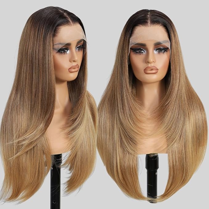 13x4 Synthetic Lace Front Wigs Pre Plucked Honey Blonde with Black 26 Inch Long Layered Straight Wigs For Women 100% Futura Premium Fiber Ready to Wear Wig With Bangs Daily Party Use
