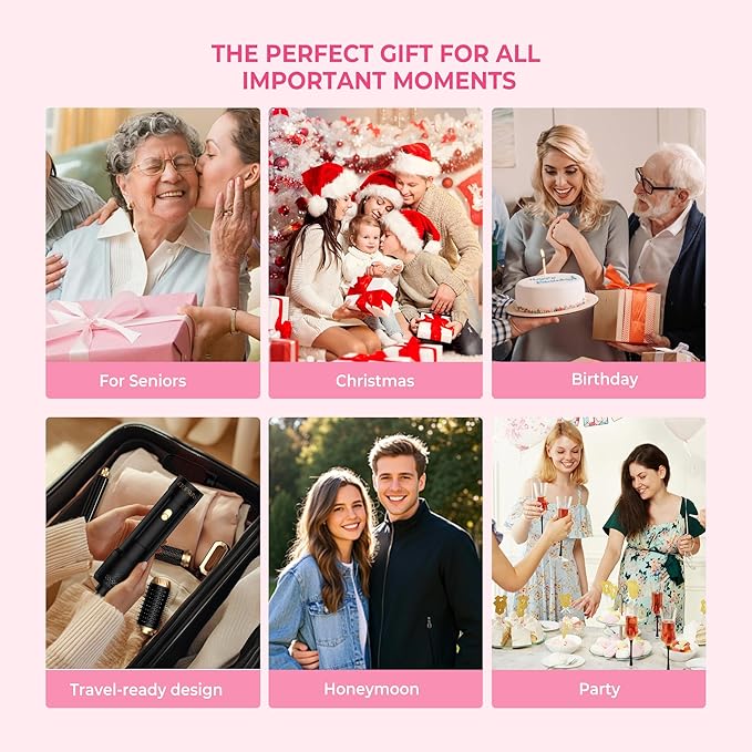 - 6-in-1 All-in-One Hair Styler: Combines a hair dryer, auto curler, straightener, volumizing brush, and round brush into one tool; Effortlessly switch between salon-grade straight hair, beach waves, or spiral curls without skill; Perfect for busy mornings, travel, and daily styling with 3 adjustable heat settings (122°F/176°F/230°F) and fast airflow.