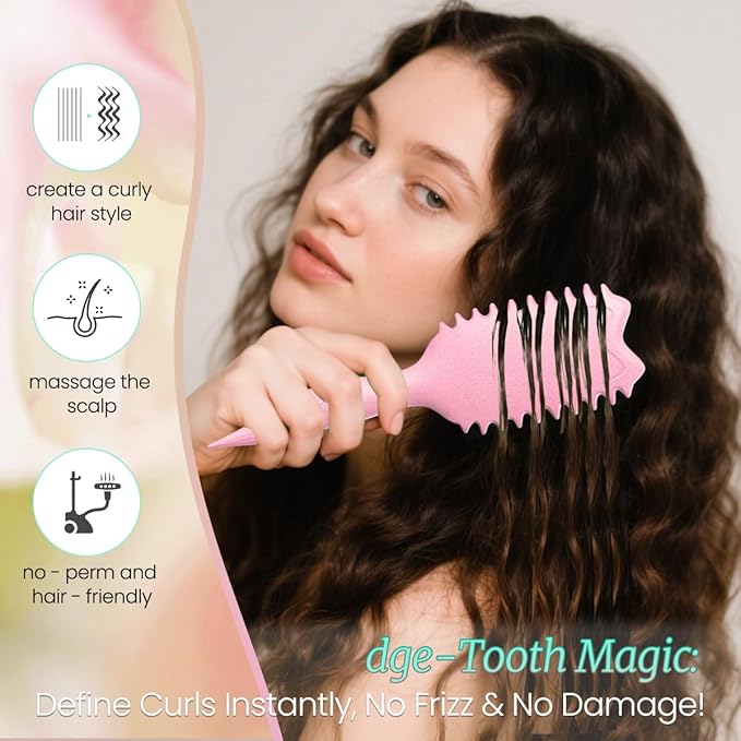 - CURL DEFINING BRUSH - ERGONOMIC DESIGN FOR EFFORTLESS STYLING:curly hair brush Engineered with contoured grip and brush for curly hair staggered teeth to detangle curls 30% faster; Strategically angled bristles separate hair evenly while reducing scalp tension; Curly Hair Brush Ideal for defining natural curls or enhancing blowout waves.