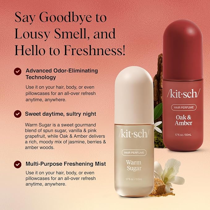 - TWO SIGNATURE SCENTS IN ONE HOLIDAY SET: Upgrade your fragrance routine with this exclusive Kitsch hair perfume holiday combo featuring Warm Sugar and Oak & Amber. Warm Sugar is a playful gourmand blend of spun sugar, vanilla, and juicy pink grapefruit for a dreamy, uplifting vibe. Oak & Amber delivers a sensual, unisex profile with velvety jasmine, juicy berries, and rich amber woods—moody, magnetic, and perfect for cooler seasons. Together, these two scents give you the freedom to match your fragrance to your mood, occasion, or style.