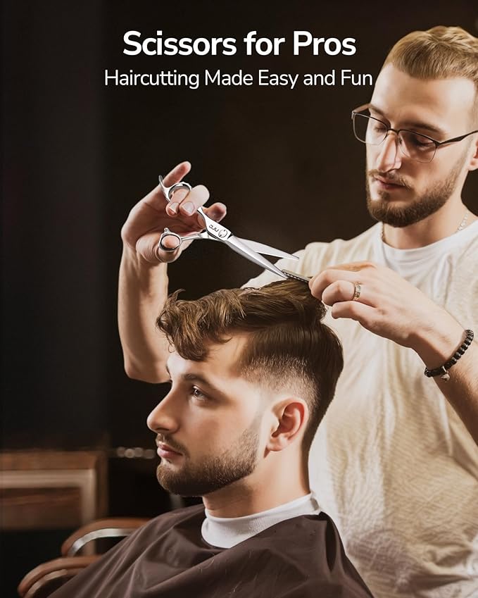 - 【LUXURY MIRROR FINISH】 These professional barber scissors are polished to be mirror-like, adding a touch of luxury and increasing their resistance to corrosion. The diamond patterns on the outer circle of finger holes make the scissors jewel-like, so your work feels more like an art than just making a haircut. Add these beautiful scissors to your tool kit