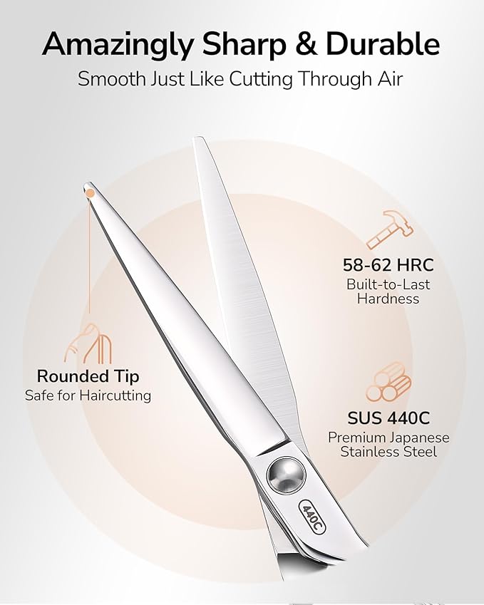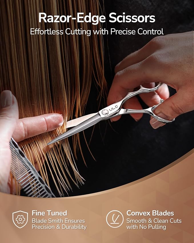 - 【ULTRA SHARP & DURABLE】 ULG 6.5" razor-edge hair cutting scissors are made of premium 440C Japanese stainless steel, with 62HRC hardness and excellent sharpness retention. Each pair is forged with convex edges and hand-honed by professional bladesmiths to be razor sharp. They cut so smooth that you feel like cutting through air, with no split hair ends