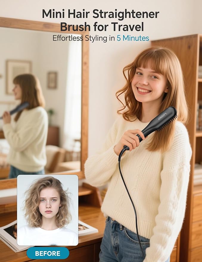 - 🎀 Mini Hair Straightener Brush for Travel & Quick Touch-Ups: This ultra-compact heated hair straightener brush is easily fitting in any purse or carry-on. Perfect for busy lifestyles, it's your go-to tool for on-the-go frizz control and sleek touch-ups anytime, anywhere