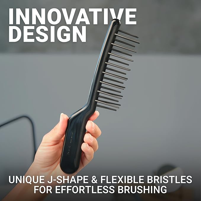 - Innovative J-Shape Design – Ergonomically curved handle and flexible wide bristles glide smoothly through curls, preventing tugging and breakage.