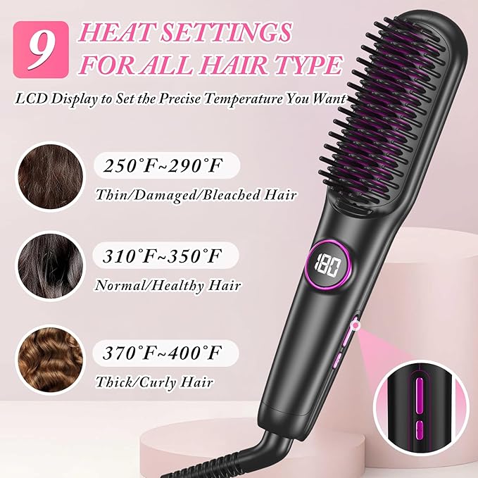 - 9 Settings Temperature: The hair straightening brush has 9 precise temperature settings (250℉~400℉) designed to fit different hair types. Fine hair: 250~290℉, Normal hair: 310~350℉, Coarse hair: 370~400℉). With the straightener comb LED display, you can easily find the most suitable temperature to create a fabulous hairstyle.