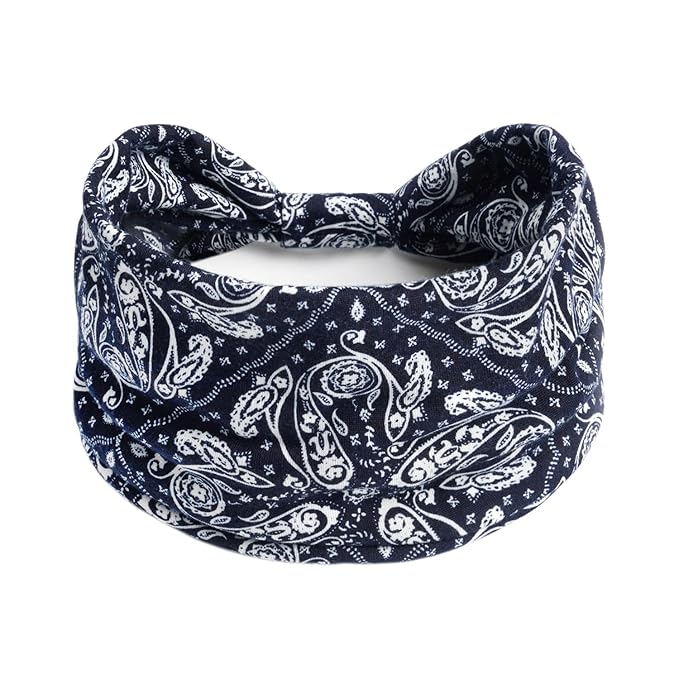 1 Pack Boho Headbands Stretch Paisley Print Bandana Headband Criss Cross Hair Bands Knotted Head Wrap Yoga Daily for Women and Girls (Navy Dark)
