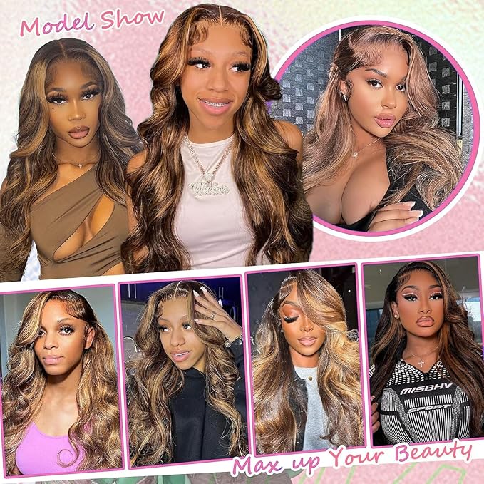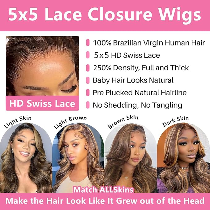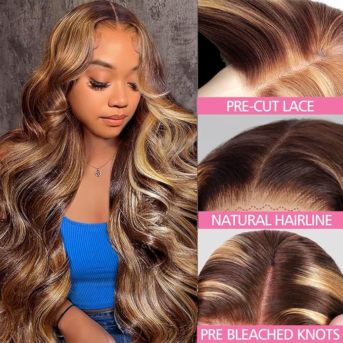 250% Density Highlight Ombre Glueless Wigs Human Hair Pre Plucked Pre Cut 5x5 HD Lace Closure Wigs Human Hair 4/27 Colored Honey Blonde Body Wave Lace Front Wigs 34 Inch