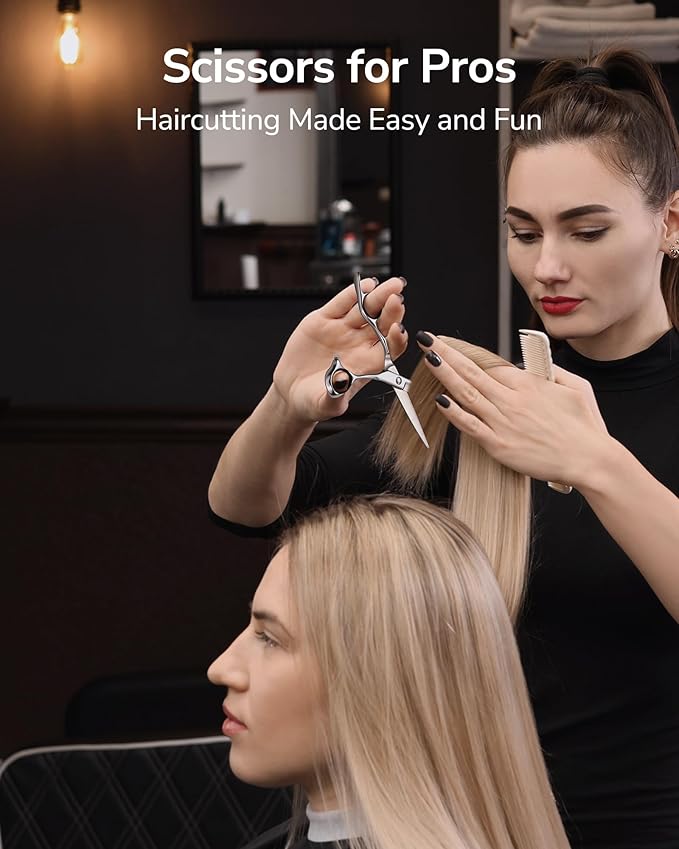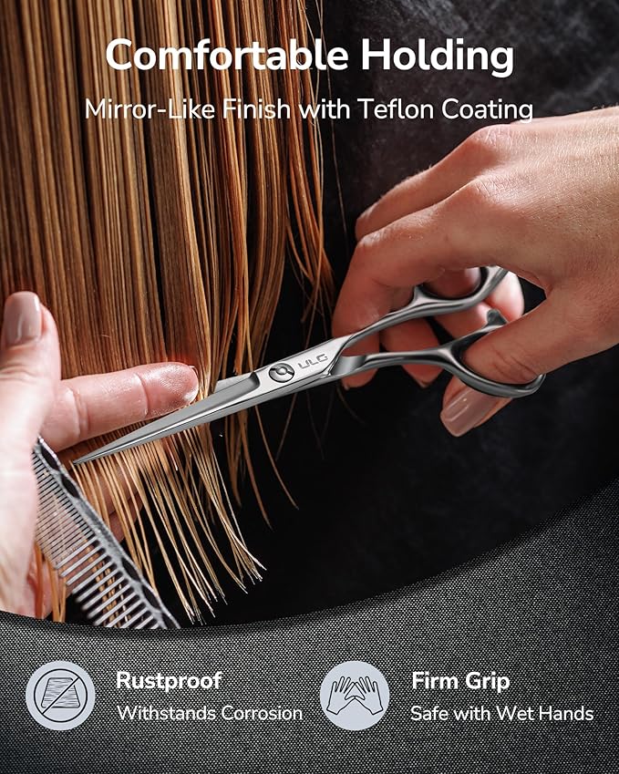- Sleek Comfortable Holding: The ergonomic handles feature a sleek, mirror-polished finish that resists stains and corrosion. Their 3D contour offers a secure, non-slip grip even when your hand is wet, ensuring excellent control during long cutting sessions. Lightweight and well-balanced, these shears help minimize finger and wrist fatigue, making them perfect for both salon professionals and home haircutting