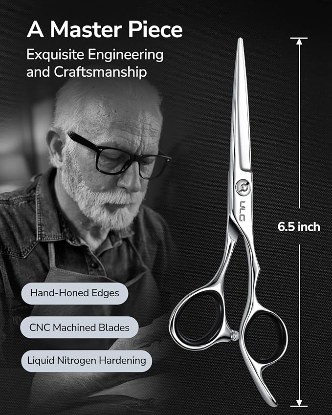 - Durable Sharp Blades: Crafted from premium Japanese stainless steel, these professional hair-cutting scissors deliver lasting sharpness and precise performance. The blades are strengthened with a liquid nitrogen hardening process for superior edge retention and long-term durability. Ideal for barbers, stylists, and home users, these 6.5-inch shears provide smooth, effortless cuts on all hair types—fine or thick, wet or dry