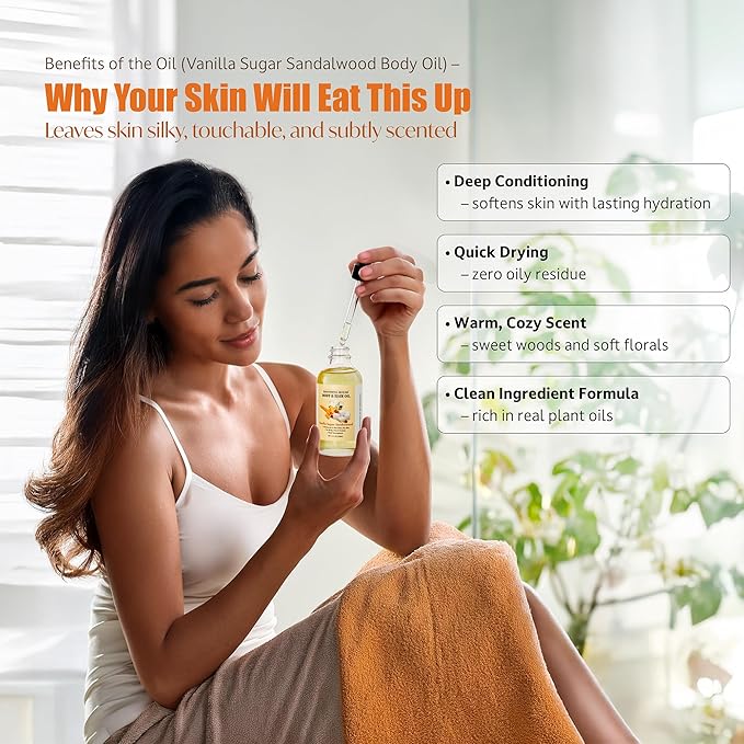Vanilla Sugar Sandalwood Body & Hair Oil – Inspired Warm Gourmand Scent – Hydrating & Nourishing Oil for Skin, Hair & Cuticles – Lightweight, Fast-Absorbing, 4 fl oz
